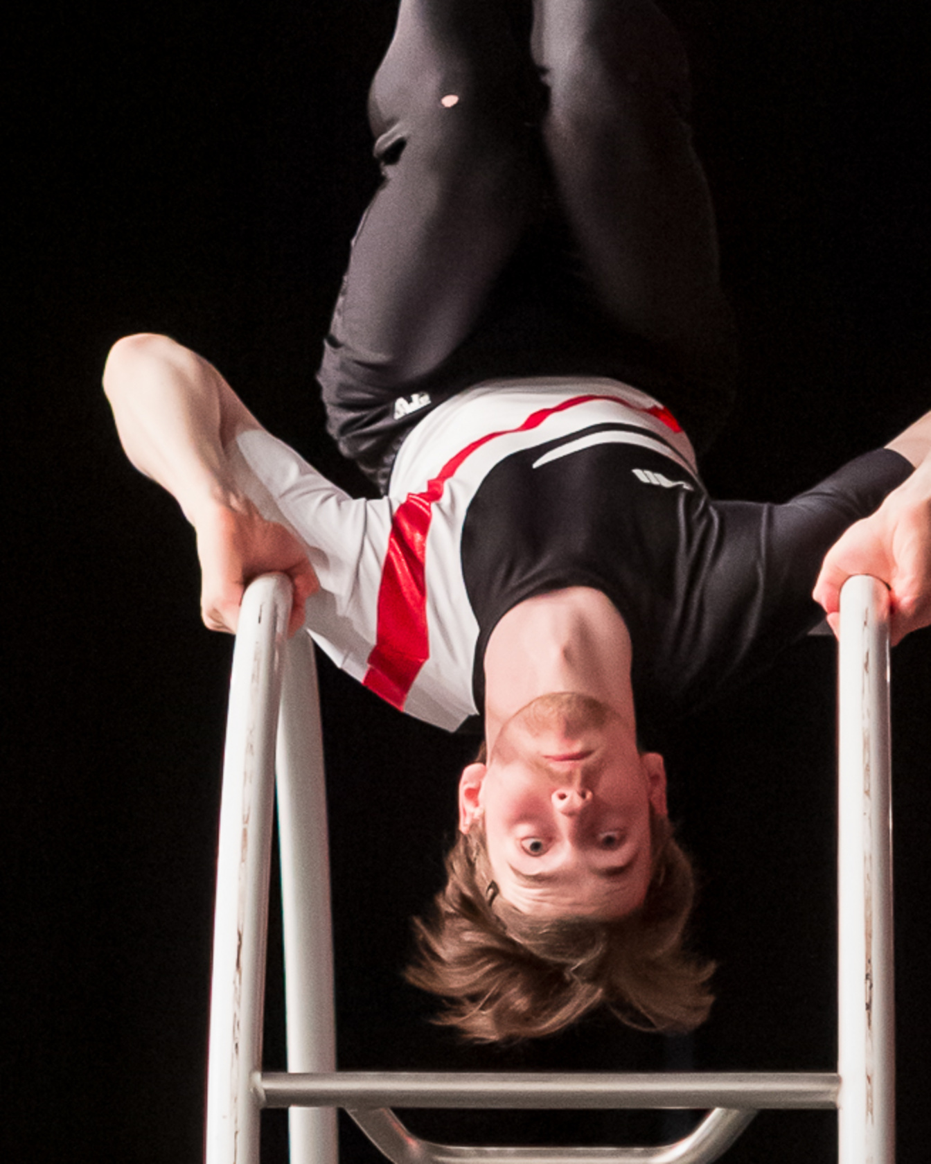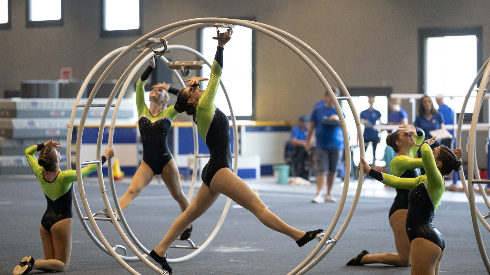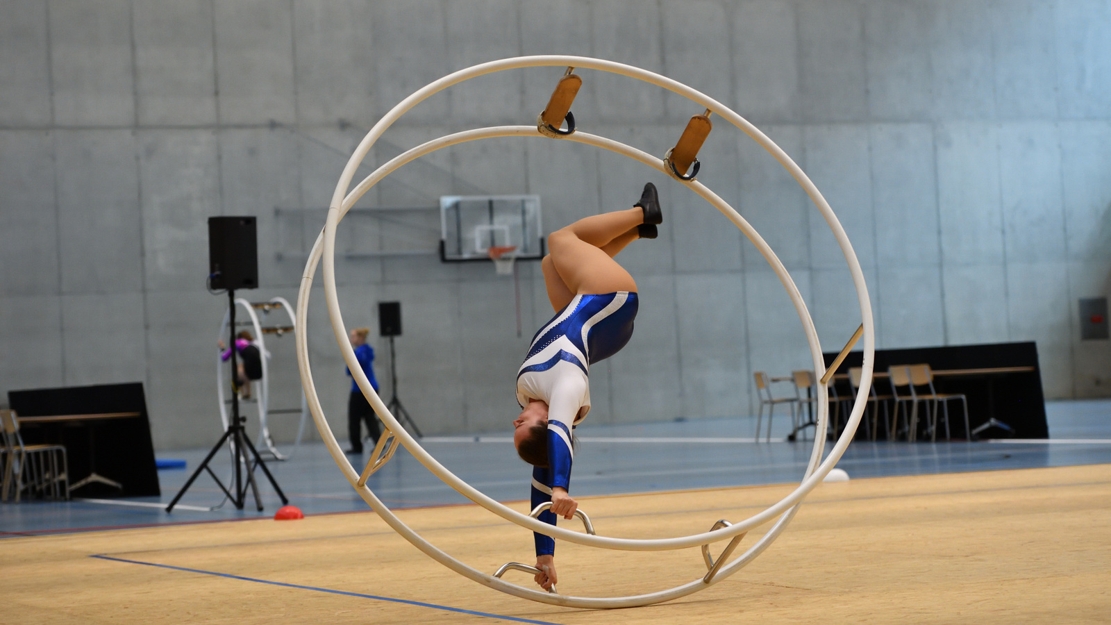la roue roule sur ses deux anneaux. Les éléments acrobatiques (équilibres sur les mains, sauts en appui, rotations) sont combinés en une prestation harmonieuse. La technique, l’exécution et la