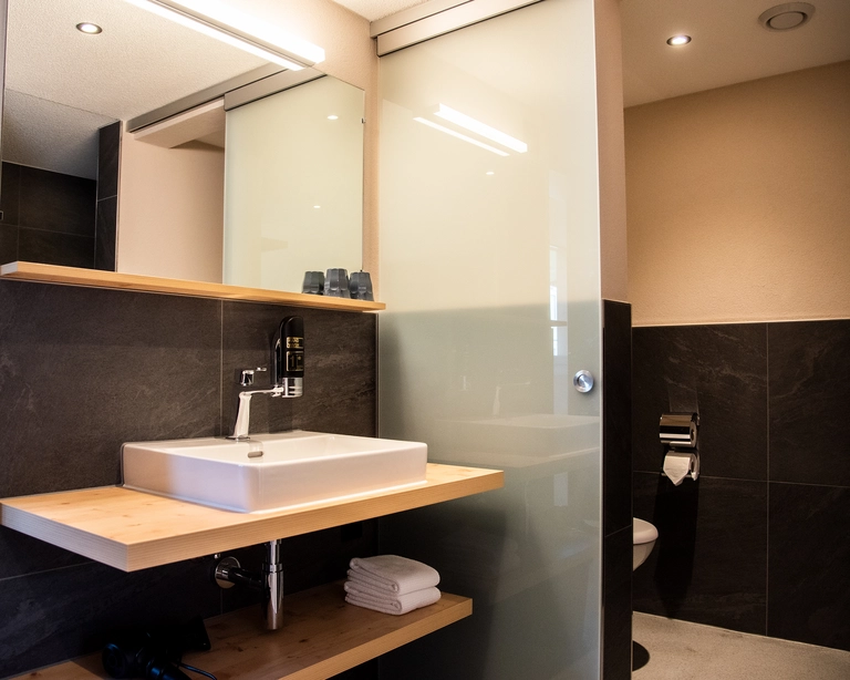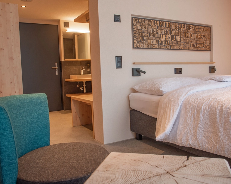 In diesen Zimmern dreht sich alles um die Wand: um die Eigernordwand und ihre Kletterer, und auch: um die Trennwand zum Bad. Denn im schicken Teil hat jedes Zimmer eine eigene Dusche und ein WC. Welche inspirierende Nordwand-Geschichte dich im Zimmer erwartet, bleibt ein Geheimnis, bis du ankommst.