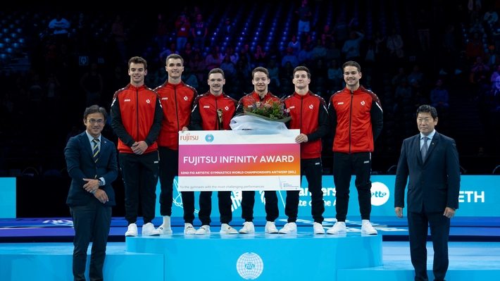 Grosse Ehre für das Schweizer Männerteam an der Kunstturn-WM in Antwerpen: Das Team um Christian Baumann, Luca Giubellini, Florian Langenegger, Noe Seifert, Taha Serhani und Ersatzturner Dominic Tamsel wurde am Donnerstag, 5. Oktober 2023 im Sportpaleis für ihre ausserordentliche Teamleistung mit dem Fujitsu Infinity Award geehrt. Der Preis ist mit 5'000 US-Dollar dotiert.